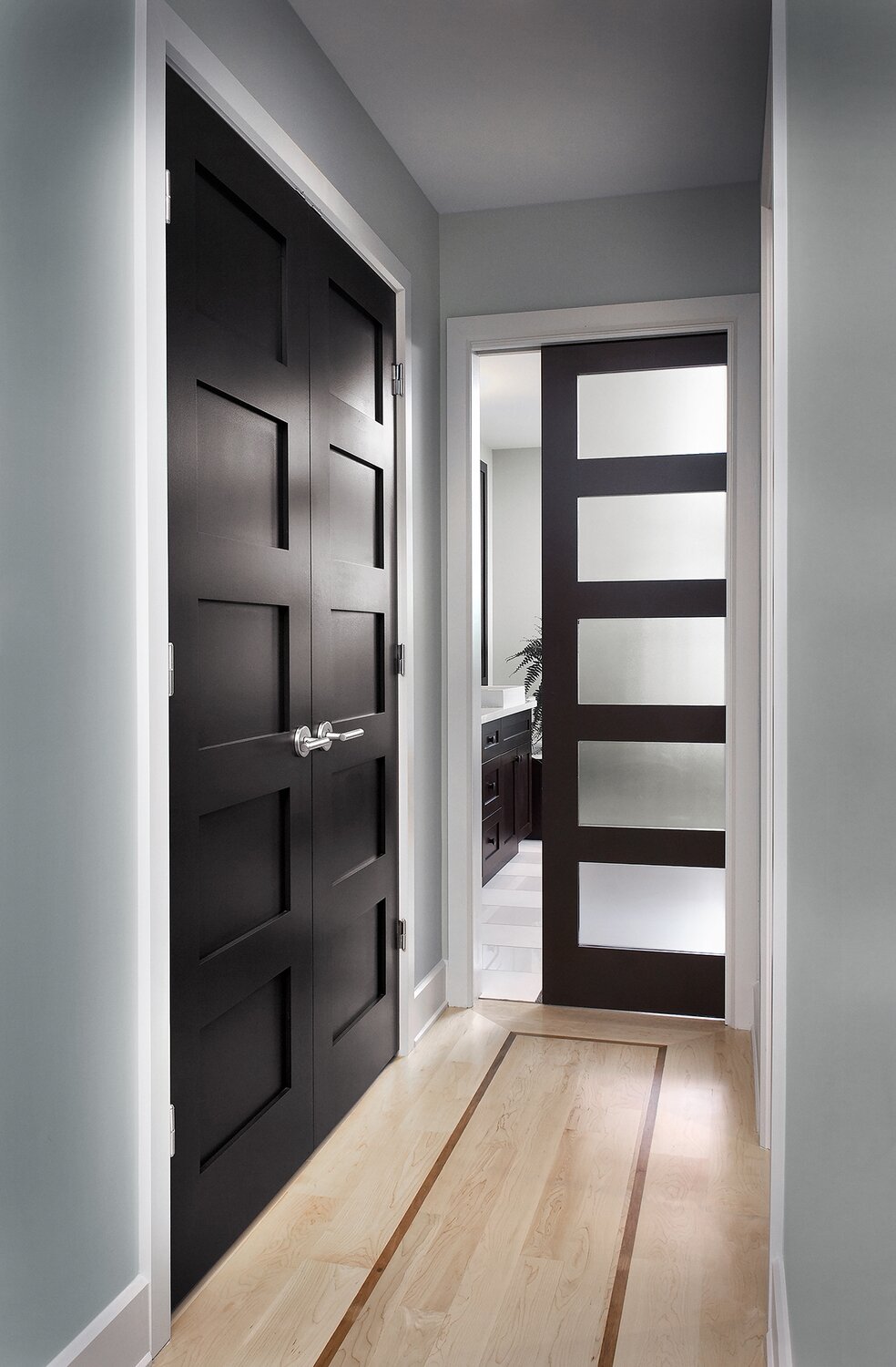 5 equal panel door, shaker style frame. Veneered or solid model available in 5 wood species or white primer. Other species and non-standard heights on request.