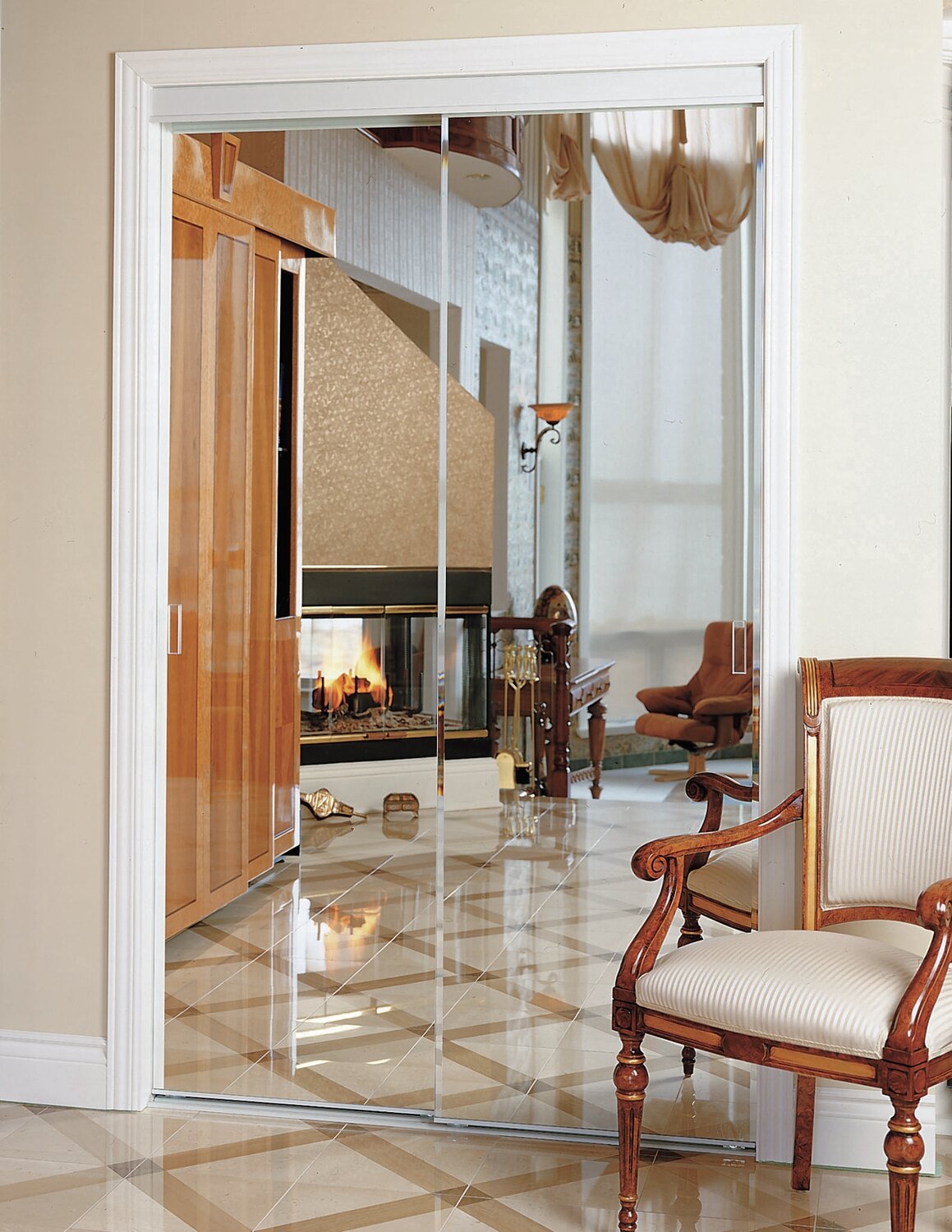 Frameless door with bevelled mirror. Arrangement of 2 to 4 panels depending on opening size. Folding and pivoting versions also available.