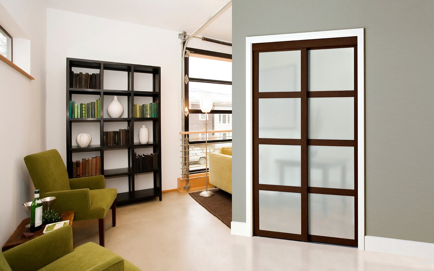 Model with 2 1/2" frame and horizontal mouldings. Choice of glass or wood-finish panel inserts. Available in 2 heights.