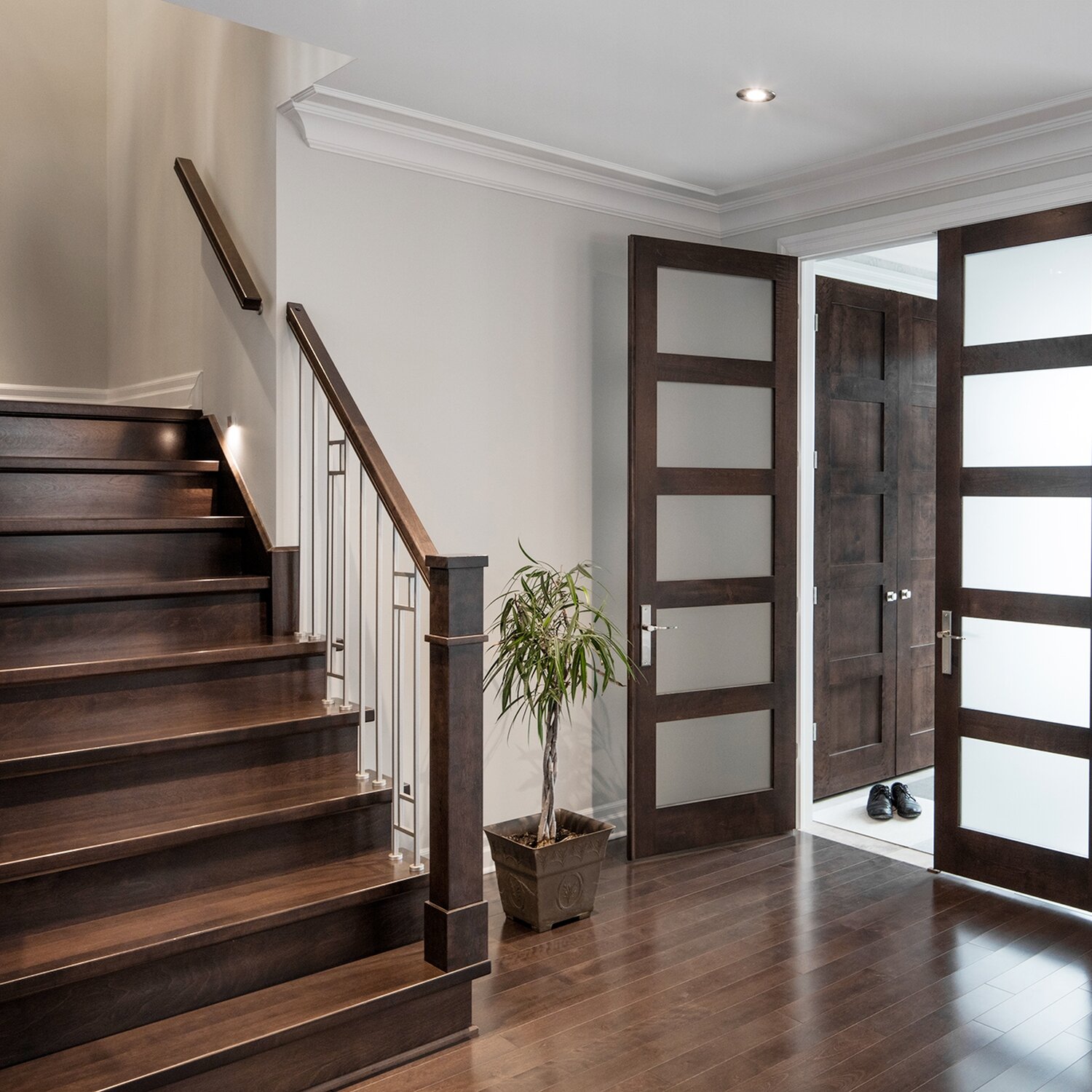 Contemporary style metal baluster with double stem. 1/2" square spindle. Arrangement with or without glass inserts. Special order wall height.