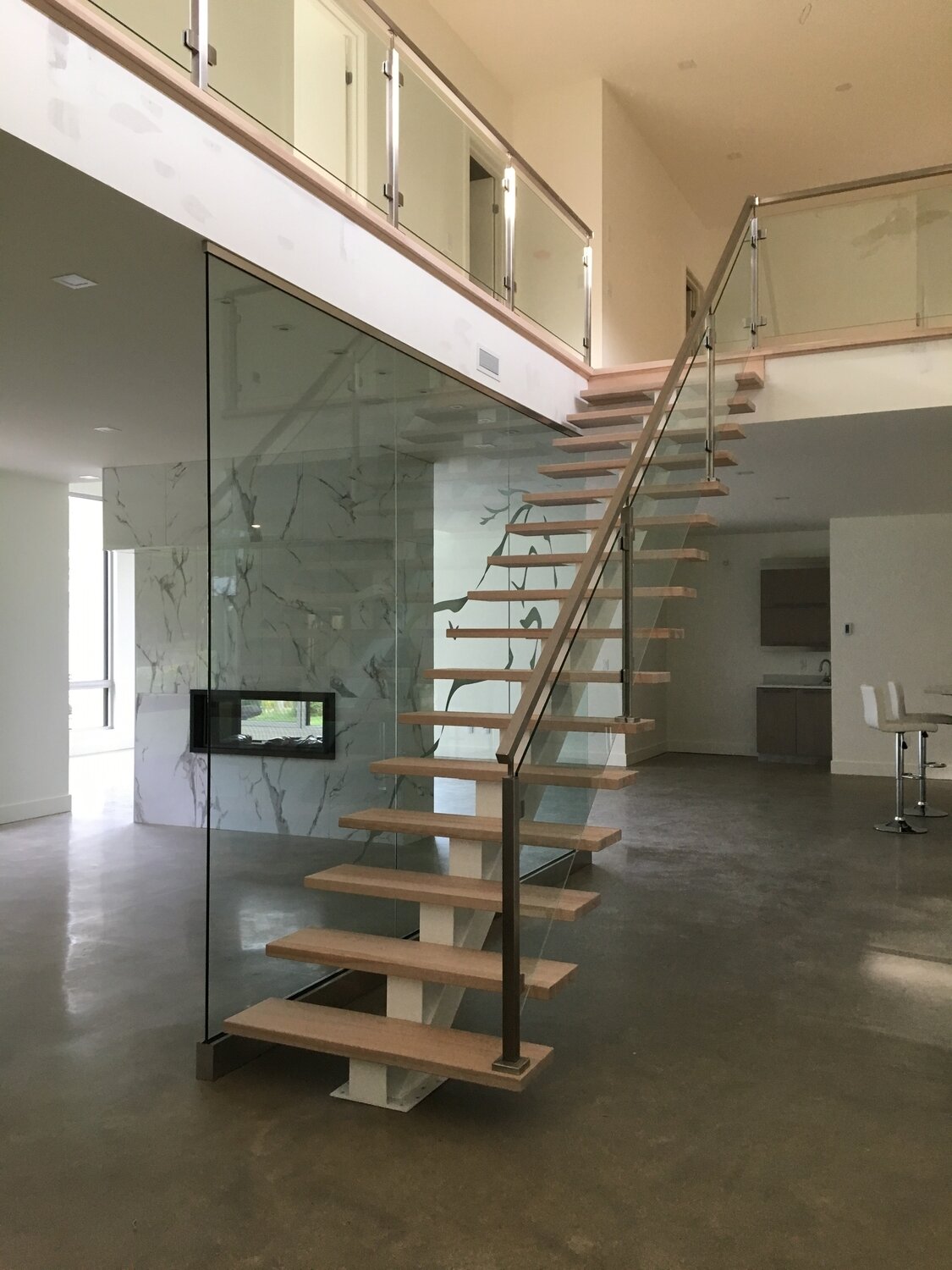 Limon central auto-portant en acier peint. Tube carré de 6 po x 6 po. Conception sur mesure