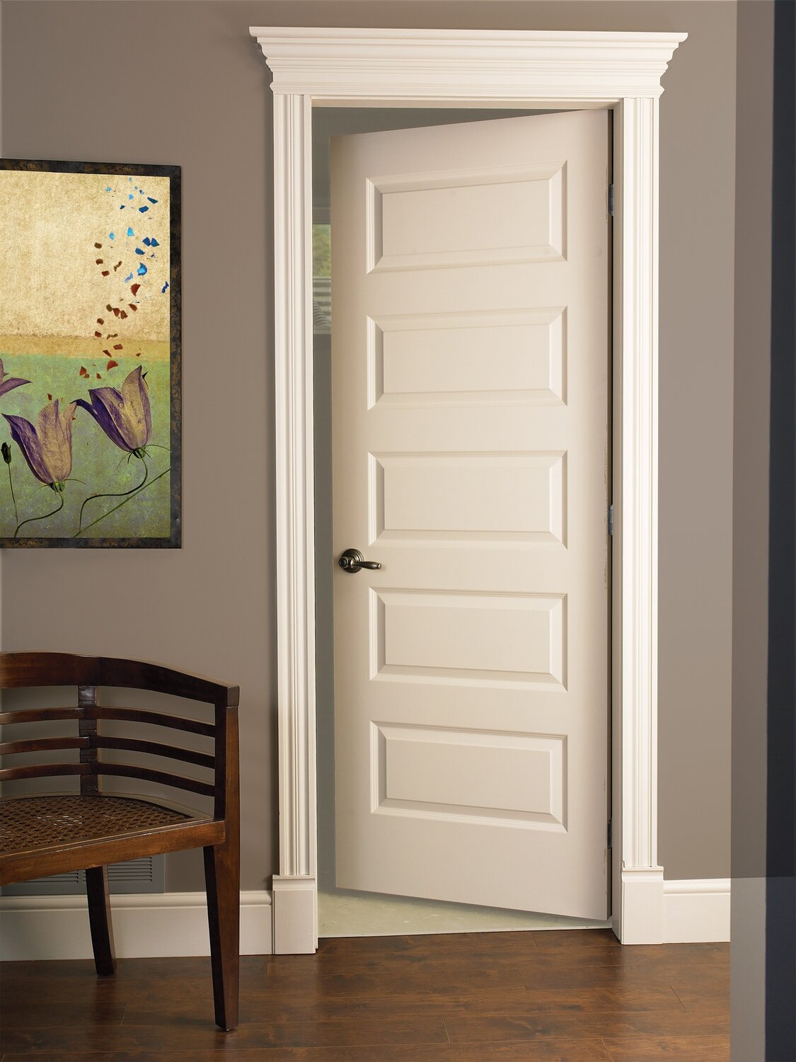 Porte à panneaux moulés et surface lisse, prépeinte. Âme creuse ou pleine, au choix. Version pliante et hauteurs non standards aussi offertes.