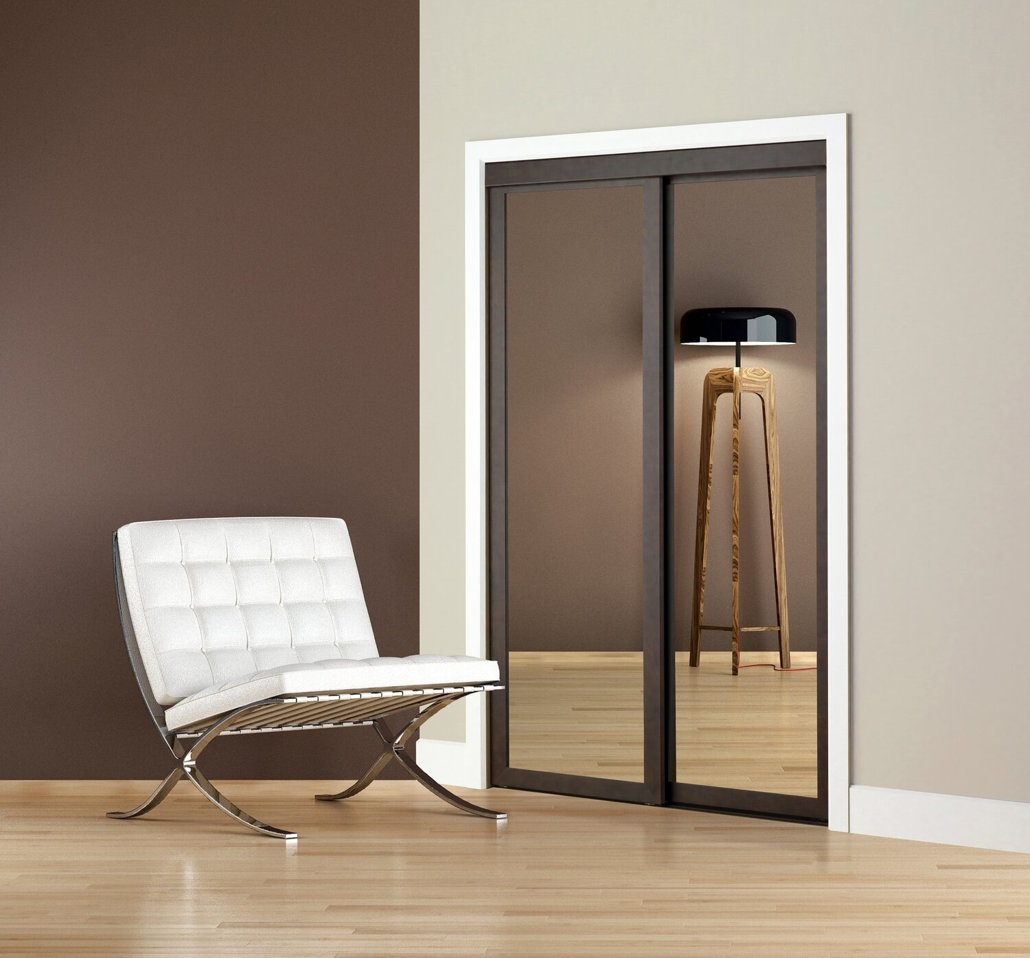 Portes coulissantes avec cadre contemporain de 2 1/2 po. Insertions au choix: miroirs, verres ou panneaux fini bois. Version pliante aussi offerte.