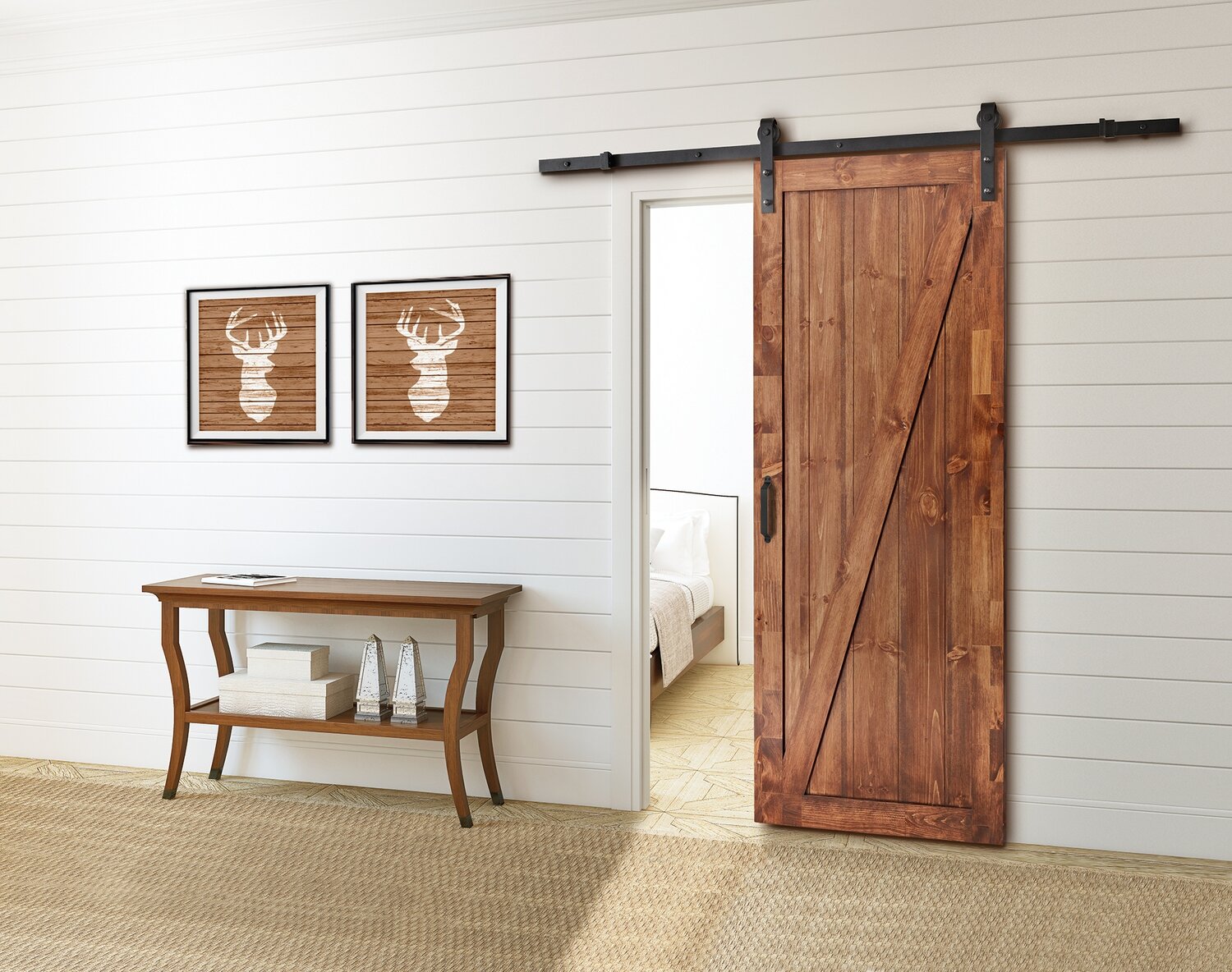 Modèle de style rustique à rail plat et quincaillerie apparente. Roulement à billes silencieux. Pour porte jusqu'à 37 po de 150 lb et moins (possibilité d'ajouter un deuxième